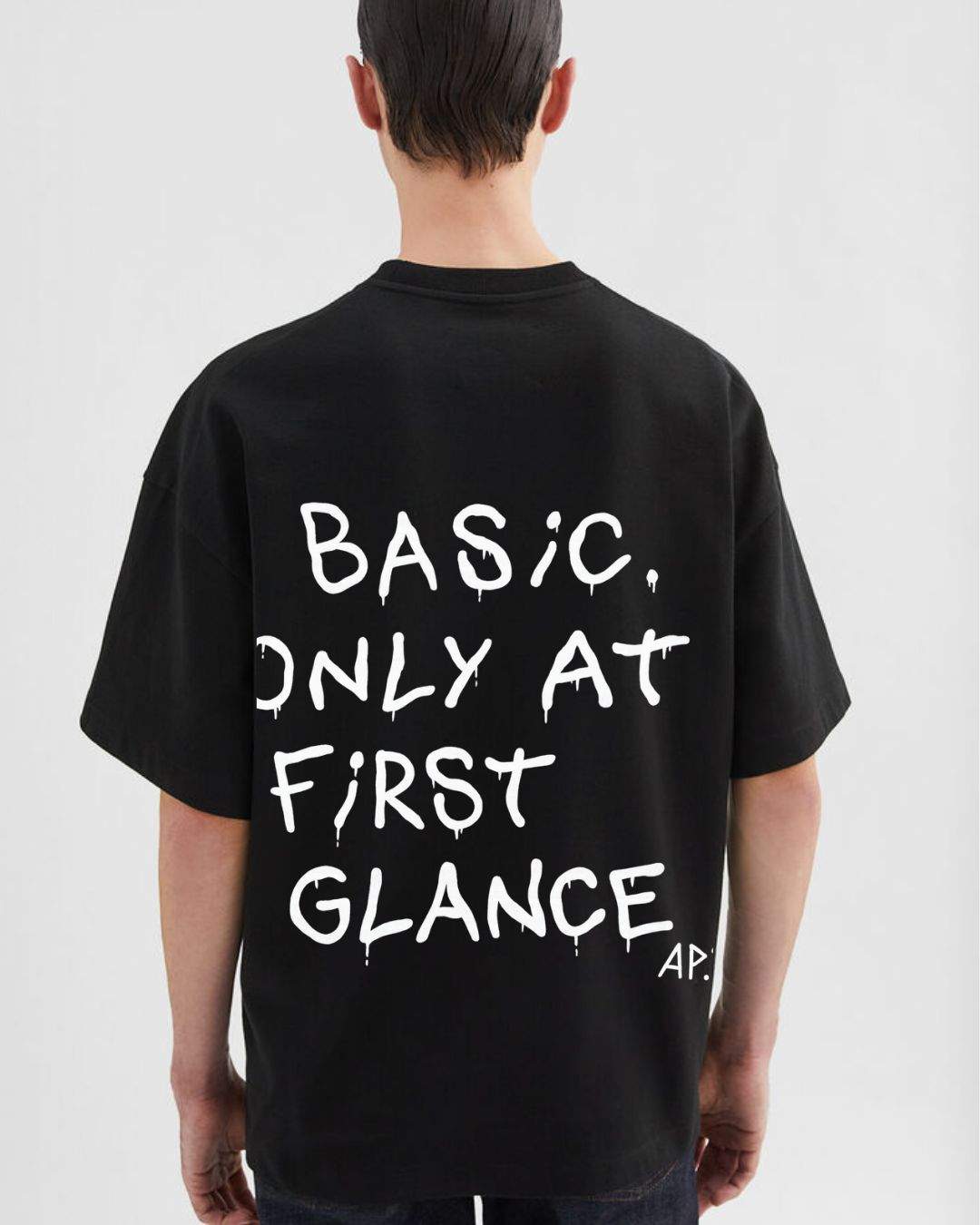 Confeccionada em algodão premium, essa peça brinca com a percepção: a frente lisa contrasta com a intervenção artística nas costas, revelando a frase “BASIC. ONLY AT FIRST GLANCE.” em arte manual. Uma provocação visual e conceitual sobre o que é — ou não — básico.